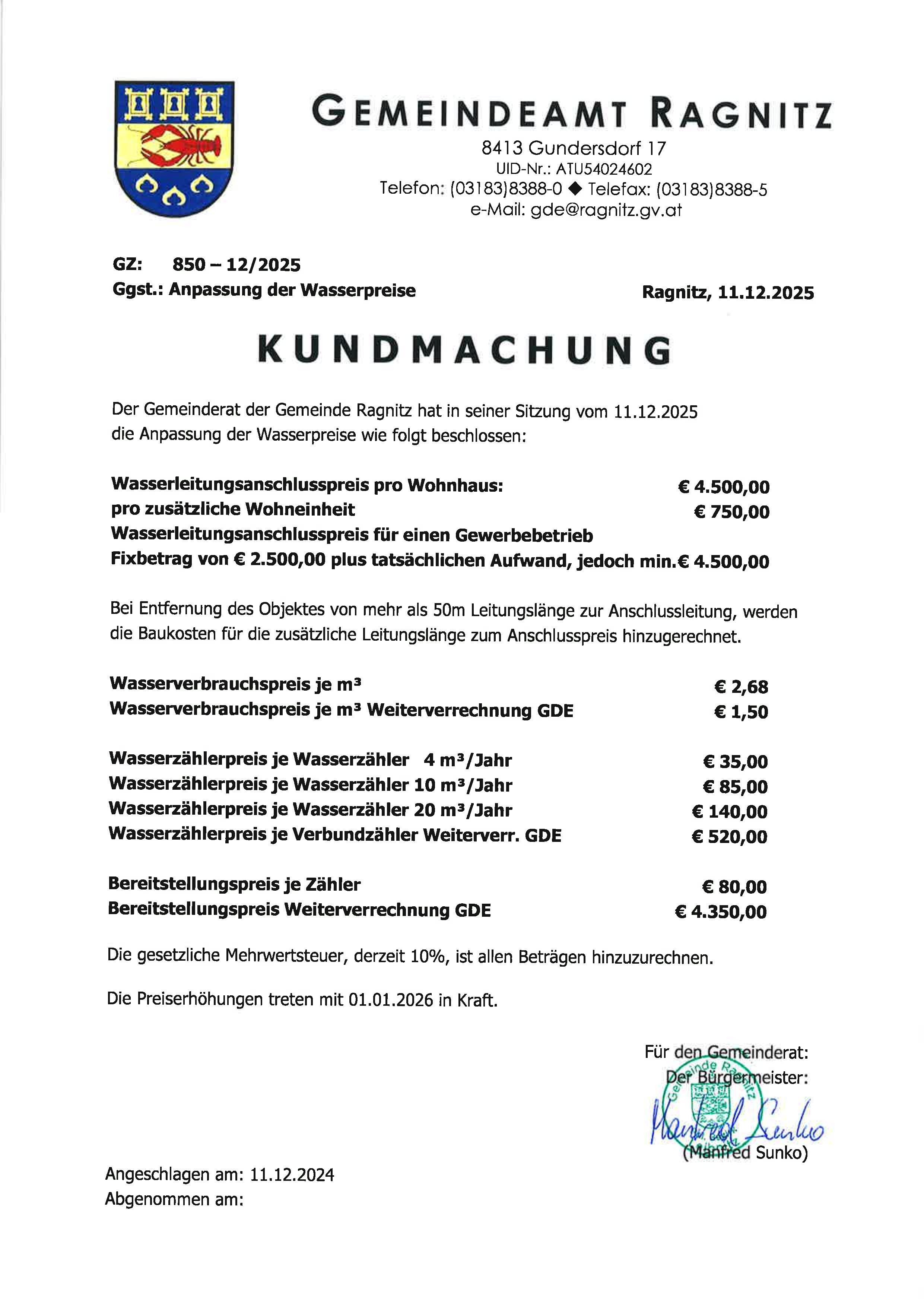KM Anpassung Wasserpreise 2026
