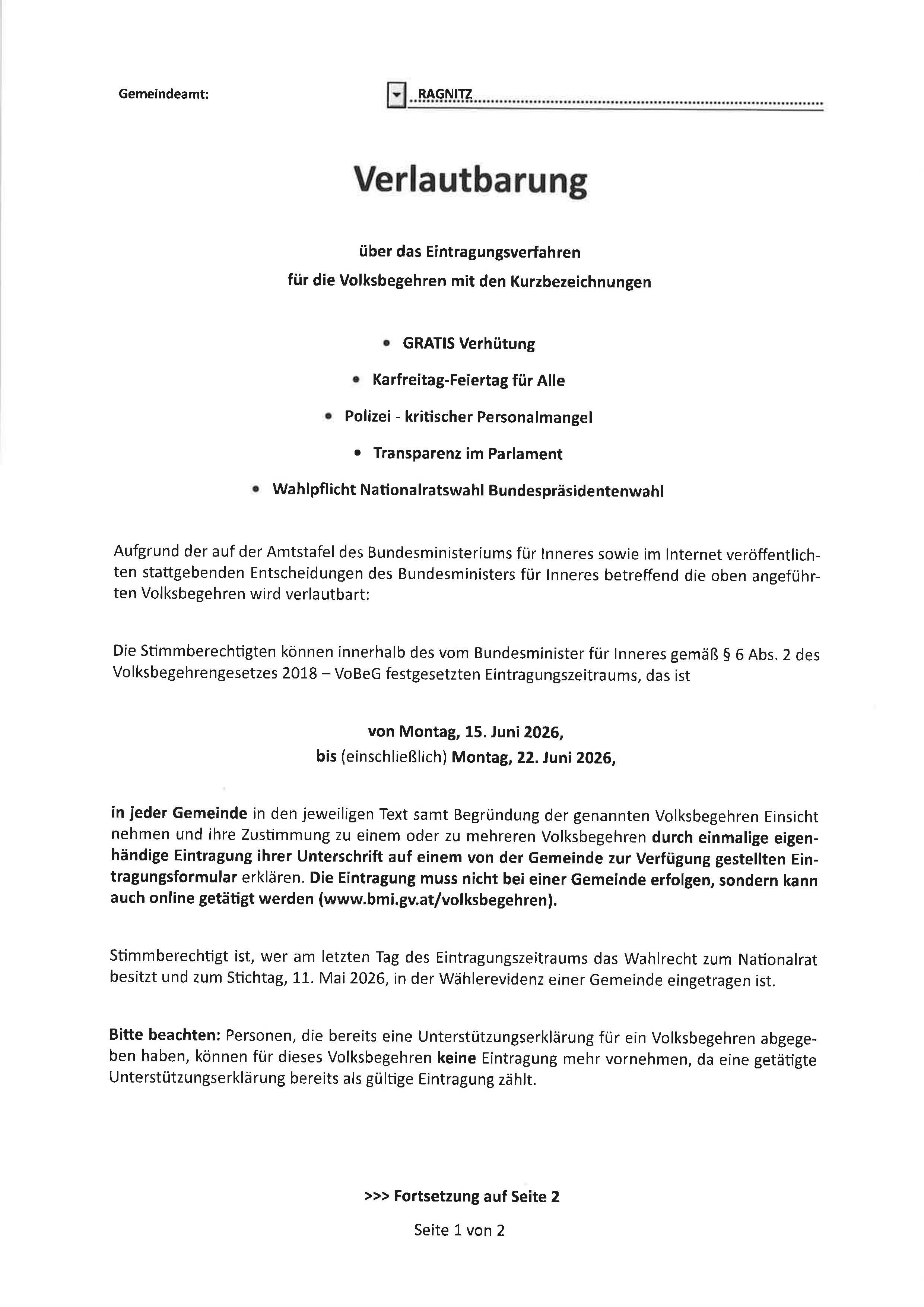Verlautbarung Eintragungsverfahren Volksbegehren
